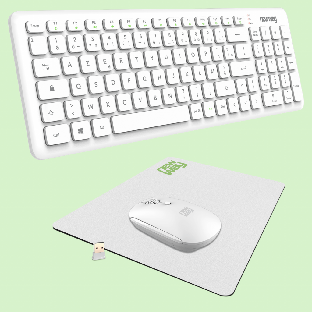 - BEZPRZEWODOWY PAKIET 3 W 1: zawiera 97-klawiszową klawiaturę QWERTY (układ francuski) z 13 skrótami multimedialnymi, 4-przyciskową mysz z czujnikiem o rozdzielczości do 1600 DPI oraz kompaktową podkładkę pod mysz.